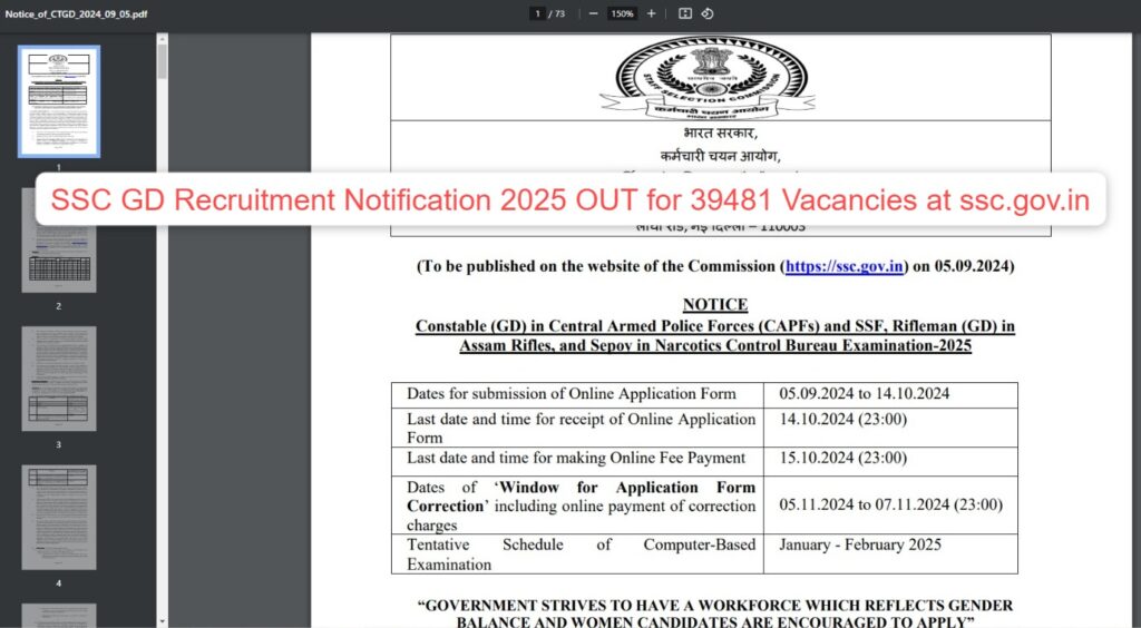SSC GD Recruitment Notification: The Staff Selection Commission (SSC) has announced the recruitment of 39,481 GD Constable positions for 2024. Applications can be submitted online starting from September 5, 2024, on the official website ssc.gov.in.